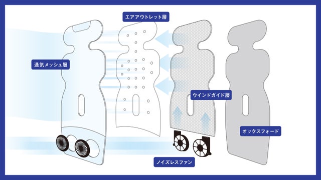 4層の通気性メッシュ構造により、ファンからの風がシート全体に行き渡るようになります。特定部分の風が強くなることがありません。