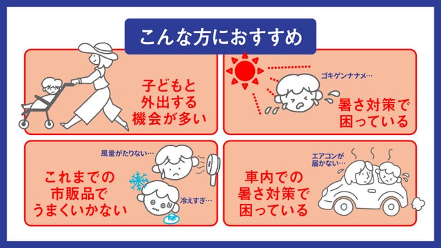 お子さんをベビーカーやチャイルドシートに乗せるたびに汗びっしょりになりお困りの方が多いのではないでしょうか。また暑さにより子どもの機嫌が悪くなったり、着替えやタオルの準備もするため荷物が多くなり、思うように活動できなかった経験をお持ちの方も多くいらっしゃると思います。