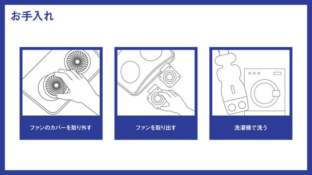 また、簡単に丸洗いできることも開発条件の一つでした。ファンを外したら洗濯機で洗うことができるので常に清潔な状態を保つことができます。