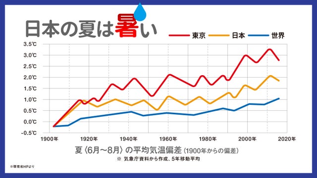 地球温暖化により日本の夏の気温は年々上昇しています。