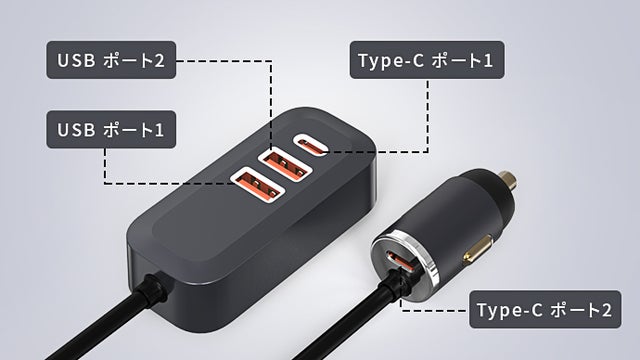 後部座席にも余裕に届ける1.5mのロングケーブル、多規格の急速充電機能、さらに4つの出力ポート…利用方法も超簡単。エンジンを掛け、シガーソケットに差し込むと給電開始!