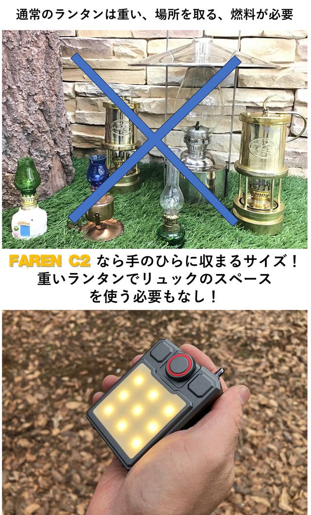 キャンプや登山などアウトドアでは必須のランタン。FAREN C2があればもう大丈夫。