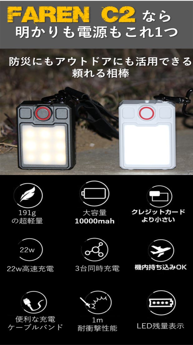 今回紹介させて頂いた「FAREN C2」はモバイルバッテリーをよりコンパクトでランタン機能も付けた商品です。この様なデザインのコンパクトランタンは5000mahが多かったのですが10000mahで作成し充分な容量を実現しました。