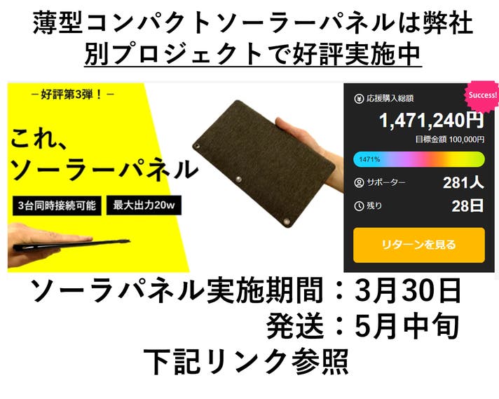アウトドアや災害時等、大いに活躍する製品で、新しい充電体験を皆様にお届け出来ると考えております