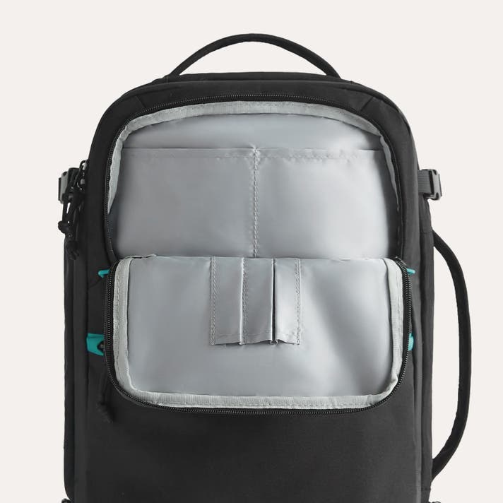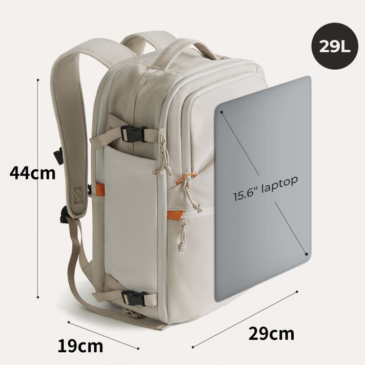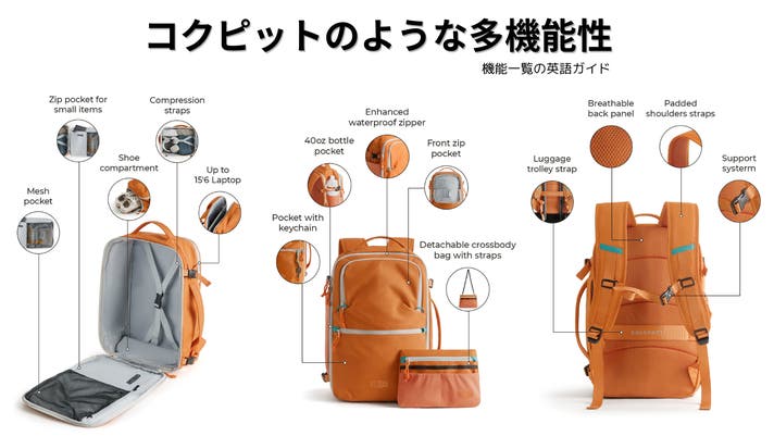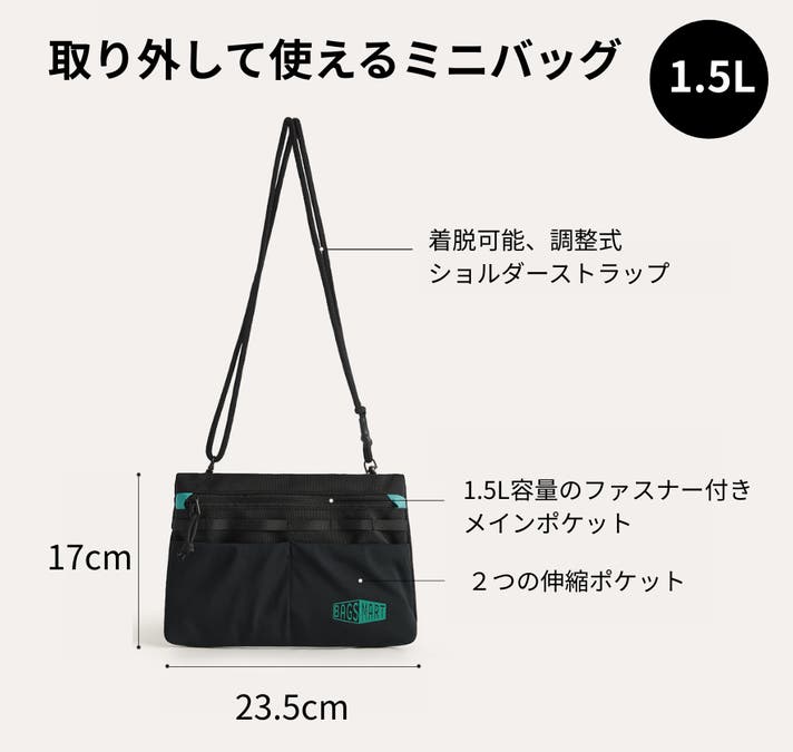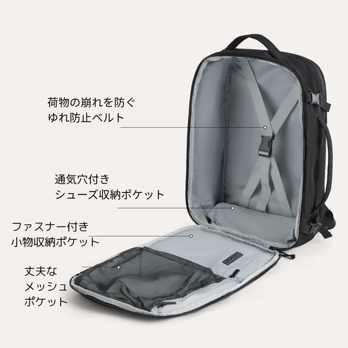 A. 本体約29L、取り外し可能なクロスボディバッグが約1.5Lの容量です。1~2泊の旅行や出張、ジム通いにも最適。9つのポケットと5つの仕切りで、荷物が自然と整います。