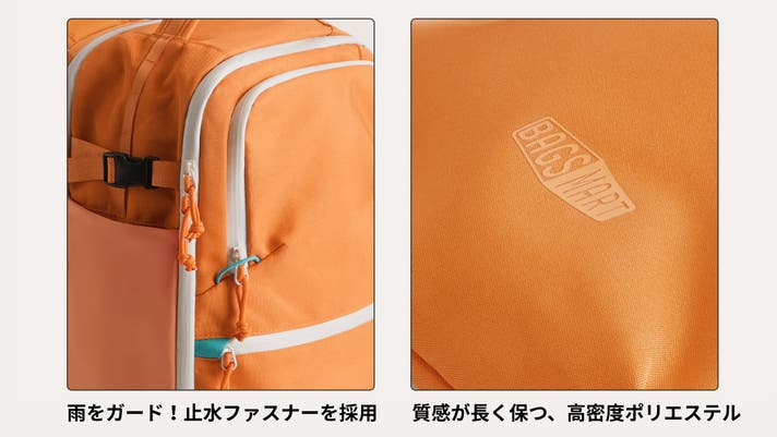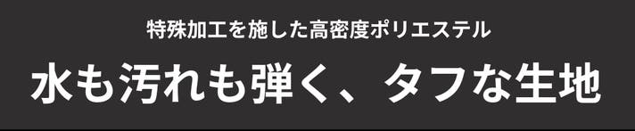 ファスナーには水の侵入をブロックする止水ファスナーを採用。本体生地には高密度ポリエステルに撥水加工を施しているので、雨をサッと弾いて汚れや染み込みを防止!