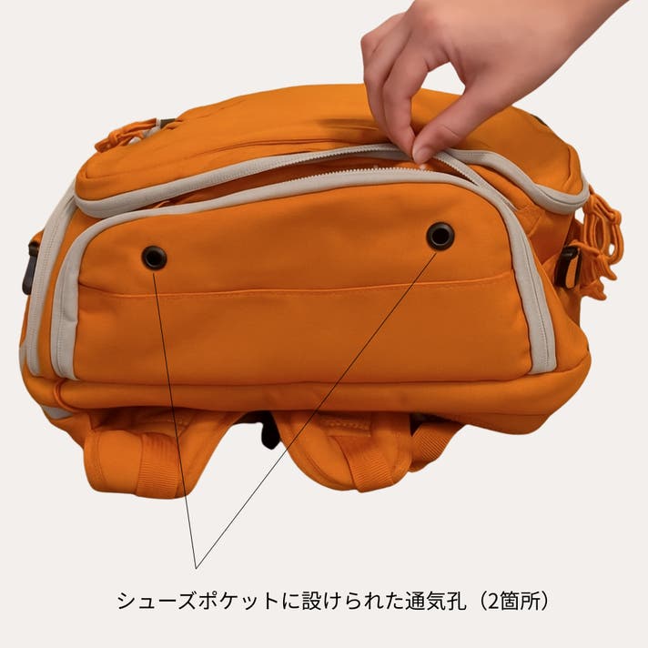 さらに2箇所の通気孔がこもりがちな湿気やニオイを逃がしてくれるから、帰り道まで快適なまま。