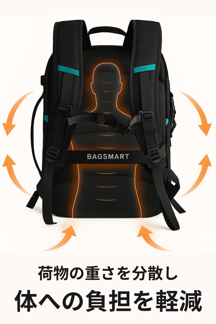 A. 背中に沿う3D立体裁断、幅広ストラップ、通気性の高いクッションなどで、長時間の移動でも快適に背負えます。