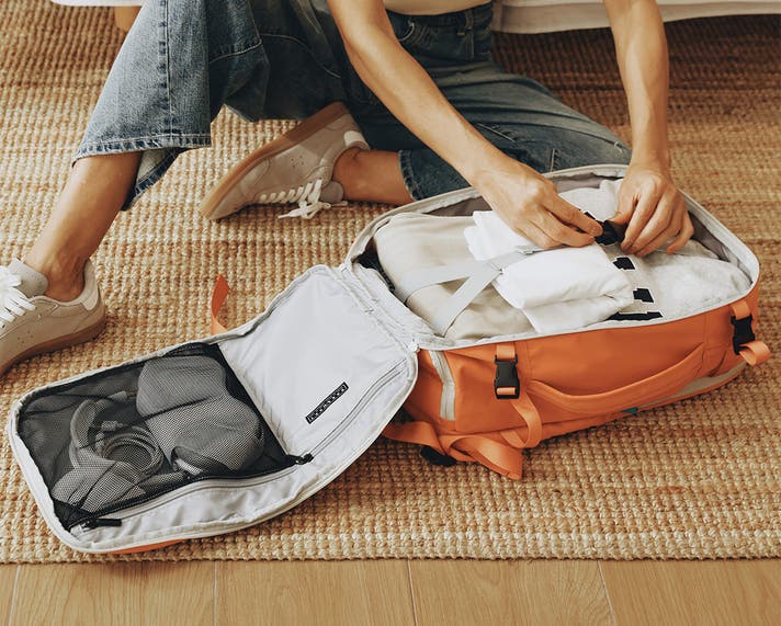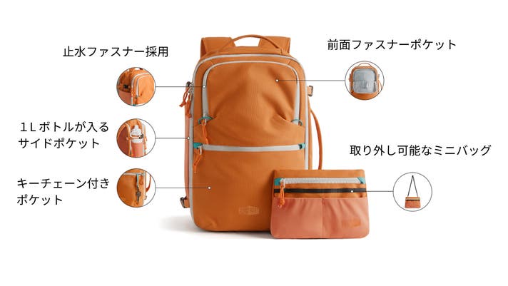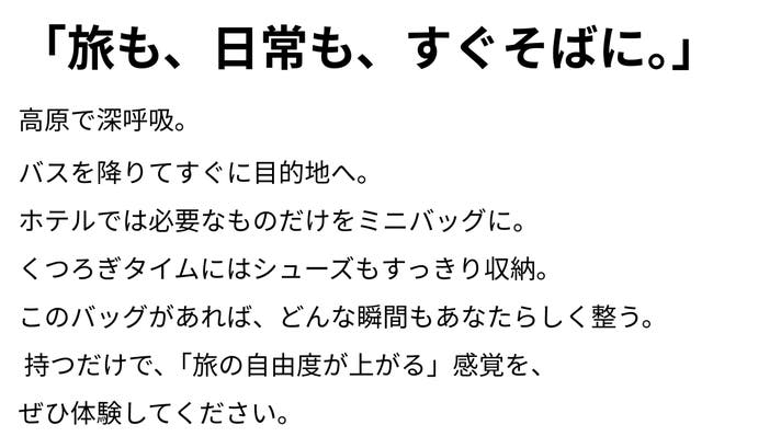 - 旅行先では、最小限だけを。ミニバッグ付きで、身軽に動ける。