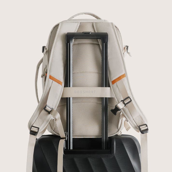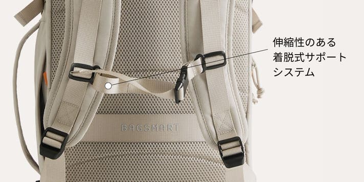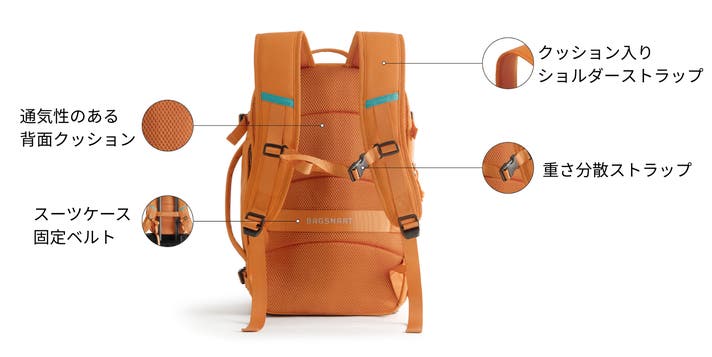 背面ベルトでスーツケースにぴったりフィット。荷物が多い旅でも、肩の負担を軽くしてスムーズに移動できます。
