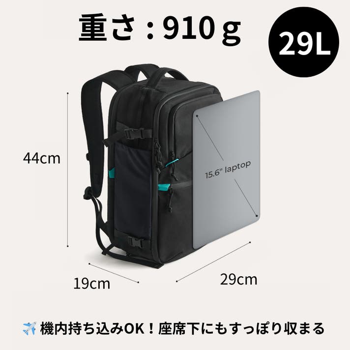 29Lの大容量なのにわずか910g。15.6インチのPCもラクラク収納。