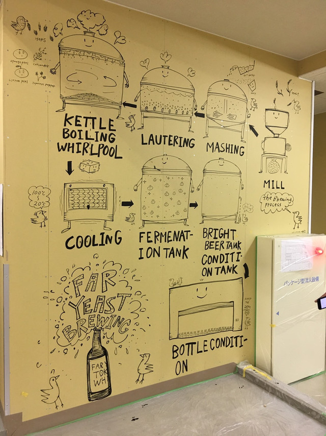 ▼源流醸造所の壁にアーティストのDISKAHさんに書いていただいた、作り方のイラストです。