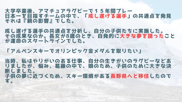 都会のビル群から雪景色に一変したあの日から 私は、二人の我が子が目指す、「世界一の選手」の夢を支える『指導者兼父親』です。