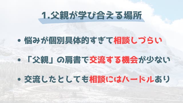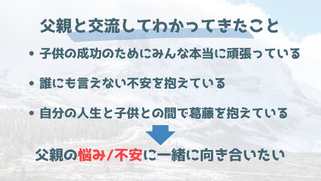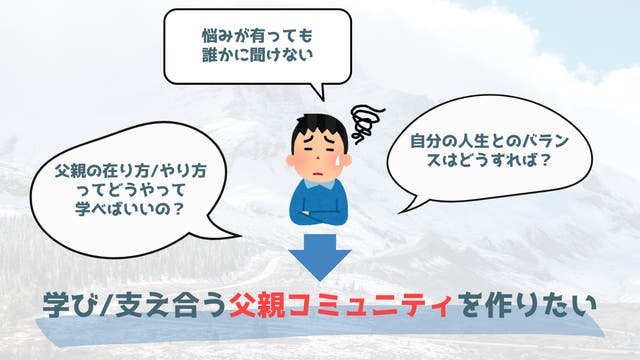 このプロジェクトは、子供の成功を願いながら1人の人間として、父親としての悩み葛藤を乗り越えてきた経験やノウハウを、同じような悩みを抱える父親と分かち合うコミュニティを作る、というものです。