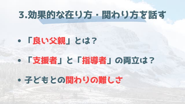 分かち合いと支え合いの中でそれぞれの父親が「自分で答えを見つける」ことをコンセプトにしていきます。
