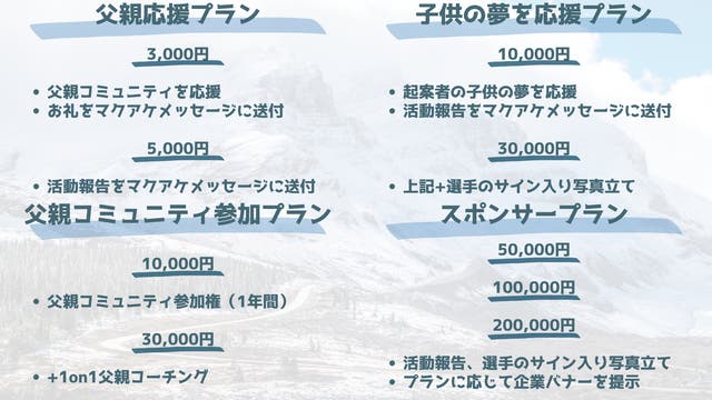 の2プランは子供の夢を育み、父親コミュニティへの参加だったり、コミュニティそのものへの応援をするプランです。