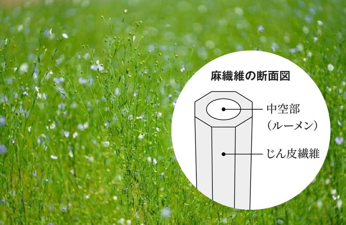 麻の繊維は鉛筆のような形状で中心部に空洞が有るため、汗を吸収し素早く発散させることができます。また触るとひんやりと感じる性質から夏の快適素材とされています。