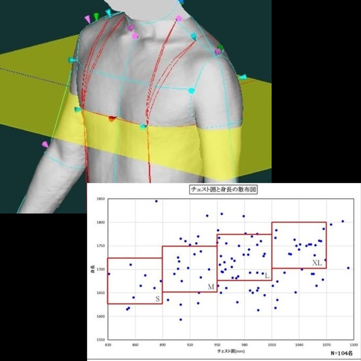 S~XLの4サイズ展開。右上の図は、計測サンプルの身長と胸囲の分布図です。