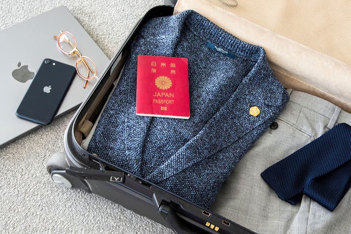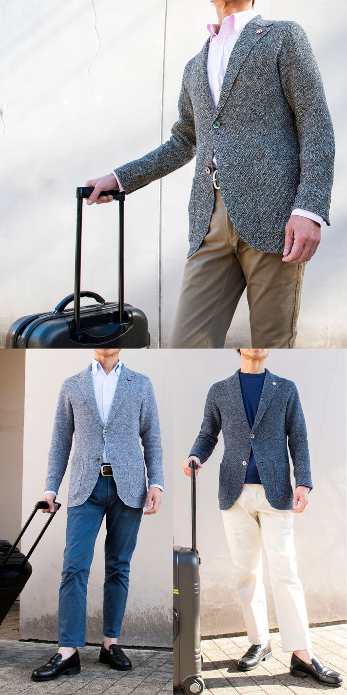 出張に : ノーネクタイとコットンパンツのビジカジスタイル、スーツケースに畳んで入れてもシワの心配不要。
