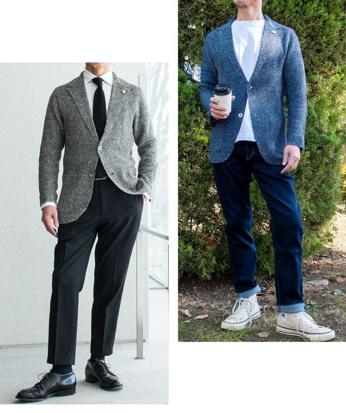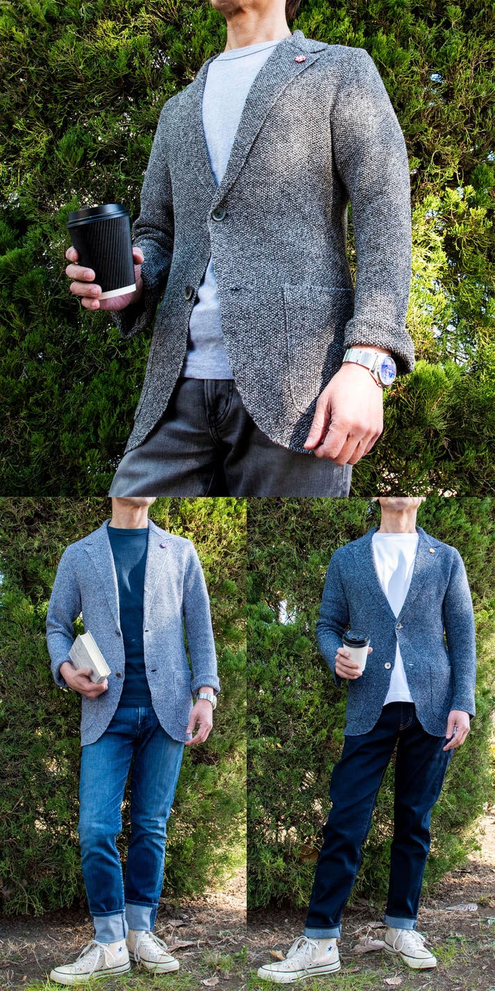 インナーがTシャツだとカジュアルになりすぎて、ジャケットを脱ぎづらいですが、ニットなので程良く上品な印象になります。