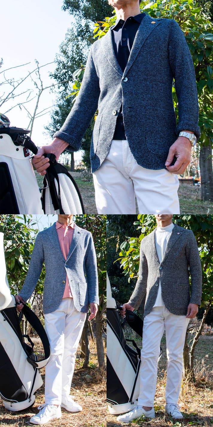 ゴルフの行き帰りに : ポロシャツやモックネックとも良い相性。ホワイトパンツで決まり。
