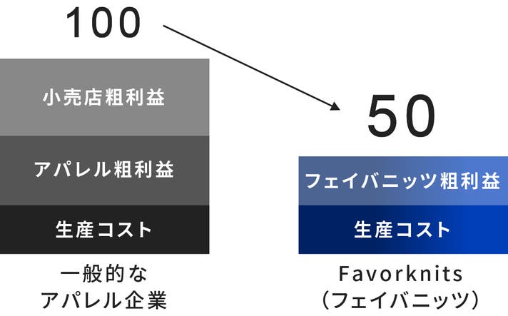 一般的なアパレル企業の商品と比較すると、同じ生産コストの商品であれば約半分の価格となります。