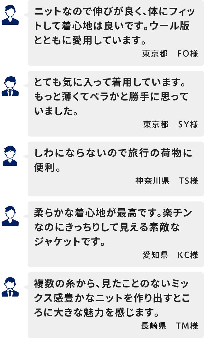 昨年【麻100%】なのにシワにならない日本製メンズニットジャケット を応援購入いただいたサポーター様のコメントです。