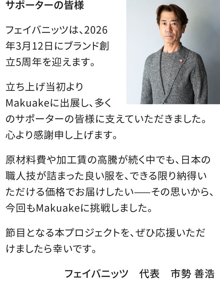 Favorknits(フェイバニッツ)は、いち早くみなさまのもとにお届けできるよう、新潟県五泉市の協力工場とともに誠心誠意製作を進めております。 6月上旬には御購入者様のもとにお届けできる様に原料の先行発注、編立・縫製のキャパシティ確保に努めておりますが、受注状況によってはお届け時期が遅れる場合が有り得ます。 万が一、その際には予めご連絡さしあげますことをお約束いたします。 また、ご購入後のサイズ交換には在庫が有る場合のみの対応とさせていただきます。 本文中に記載させていただいたスケジュールは、あくまでプロジェクト公開時点の予定です。応援購入の性質上、配送遅延のおそれがございます。 原則として、配送遅延に伴う応援購入のキャンセルはできませんが、リターン配送予定月から1ヵ月を超えた場合には、希望者に限りキャンセルにて対応させていただきます。
