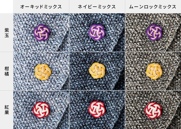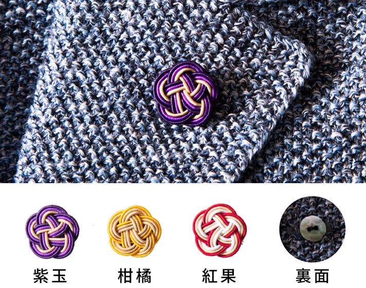 ジャケットの襟元に付く水引ブートニエールは「紫玉」「柑橘」「紅果」の3色展開。