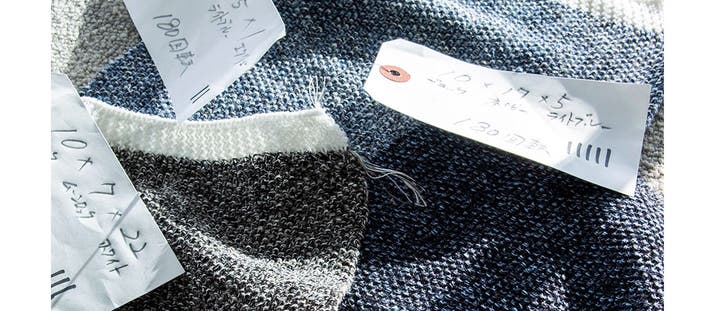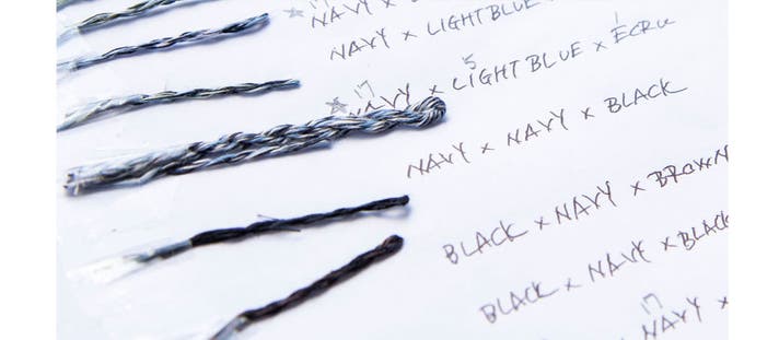 厳選した色の組合せの糸でスワッチを工場さんに編んでもらい、