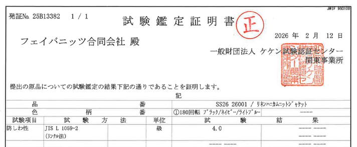 公的検査機関の試験で、高水準の防シワ性4級を達成しました。