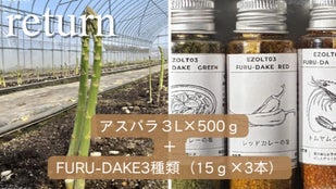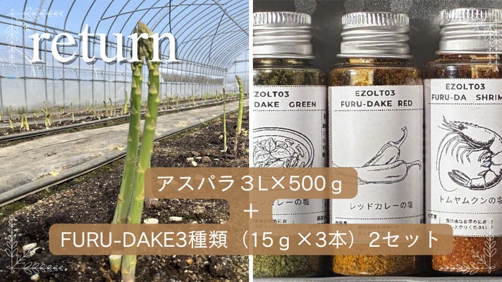 北海道長沼町さかい農園産アスパラとFURU-DAKE3種(15ℊ3本)の2セットです。
