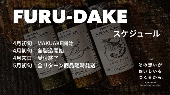 ご存知の通りは、北海道は日本の食糧基地と呼ばれています。その中でも、こだわりを持って品質を重視している生産者も沢山いらっしゃいます。そんな生産者と共に料理人が本来あるべき姿をこの”FURU-DAKE”を通じて皆様に知っていただければと思い今回MAKUAKEに参戦いたしました。沢山のご応援、よろしくお願いいたします。