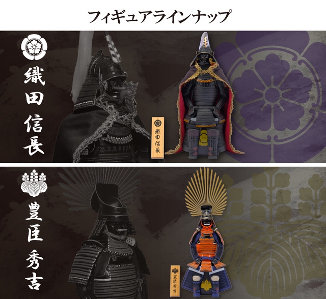 戦国三英傑といわれる織田信長、豊臣秀吉、徳川家康がラインナップ。天下泰平の世へ導いた3人の甲冑を同スケールのサイズで飾ることが出来ます。