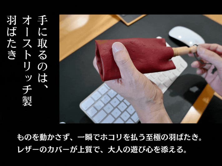 もともとは車の埃取りとして人気を集めていたアイテムでしたが、羽毛が軽やかにホコリを払う様子は静かで心地よく、車だけでなく書斎にもふさわしいと考えたのです。