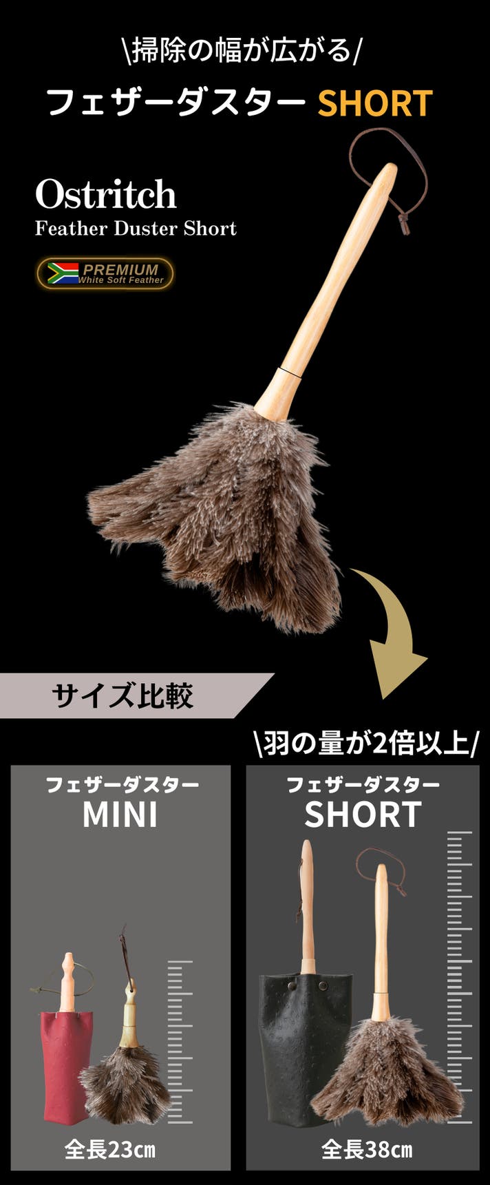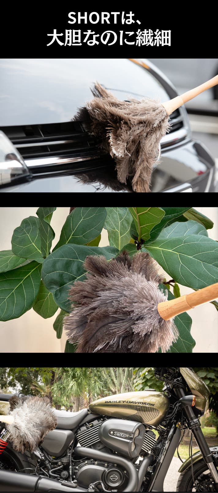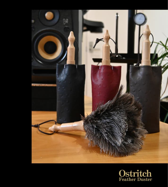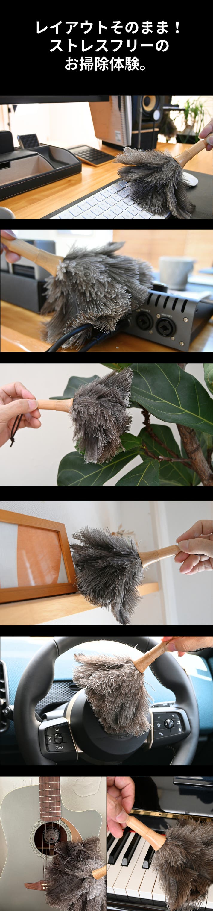 選んだのは、南アフリカ産のオーストリッチ羽毛。しなやかで繊細な毛並みが、驚くほど効率的に埃を集めてくれます。手に馴染む天然木のグリップ、羽毛を守るために誂えた型押しレザーの専用カバー。細部まで、美しさと機能性を追求しました。