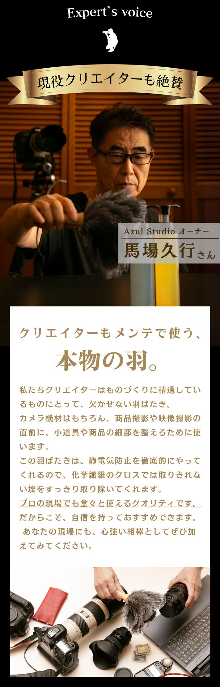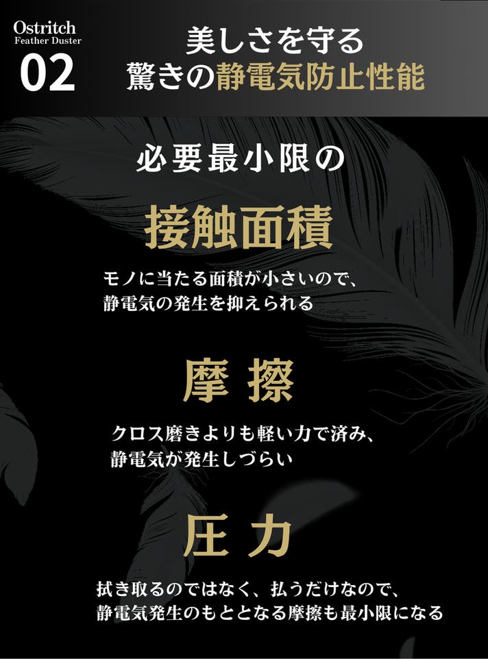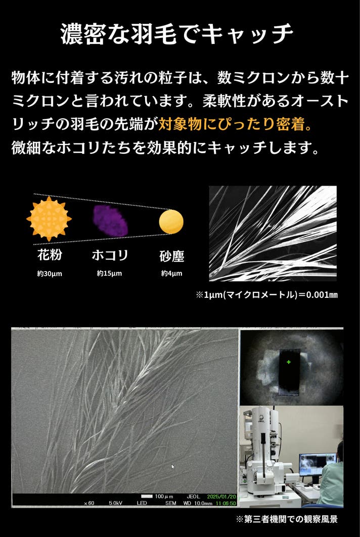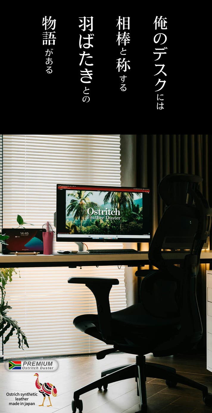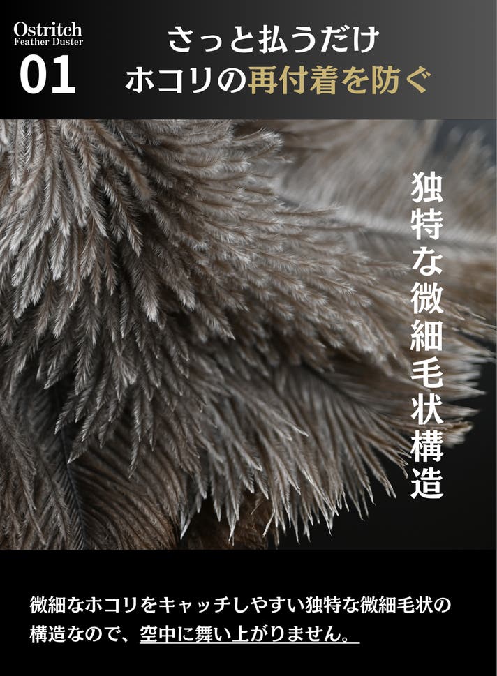選んだのは、南アフリカ産のオーストリッチ羽毛。しなやかで繊細な毛並みが、驚くほど効率的に埃を集めてくれます。手に馴染む天然木のグリップ、羽毛を守るために誂えた型押しレザーの専用カバー。細部まで、美しさと機能性を追求しました。