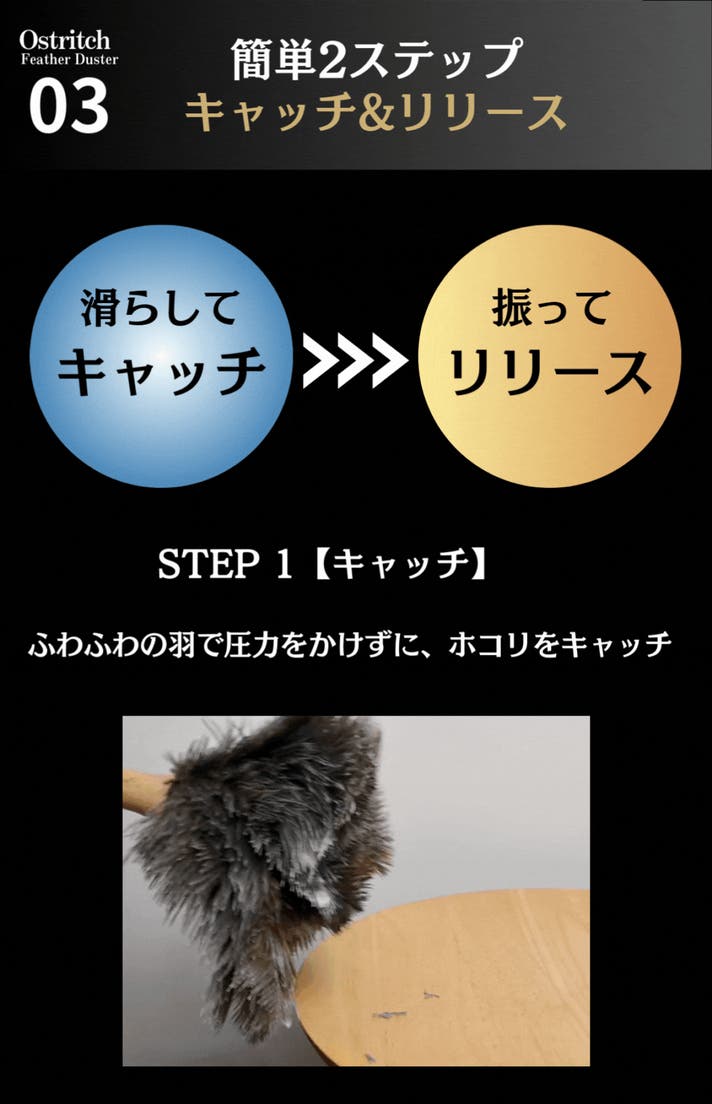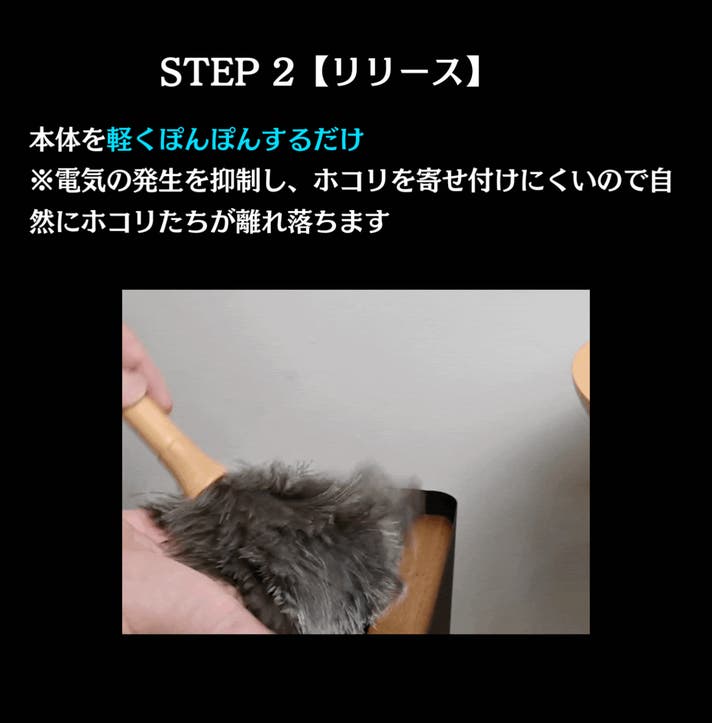 ・羽ばたきを時折り回転させながら優しく撫でるようにホコリをキャッチください。