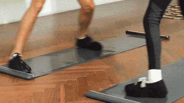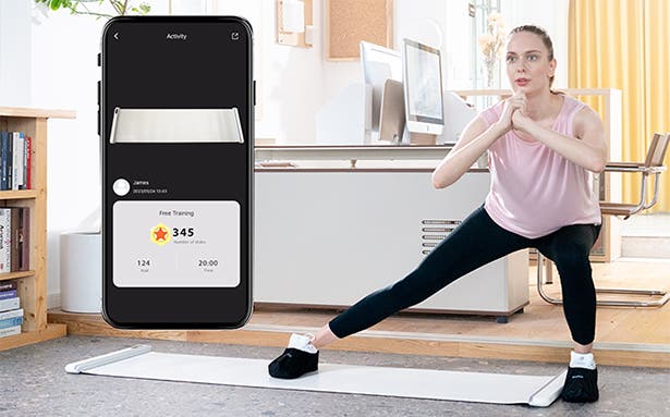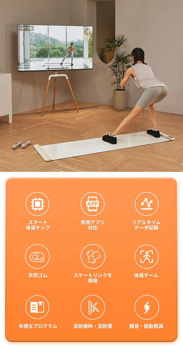 スケートのように左右に滑る動作で腰、腹、臀部、腿、背中を中心に全身の筋肉を鍛え、バランス感覚や敏捷性のトレーニングをお手伝いします。運動データはアプリで記録可能です。