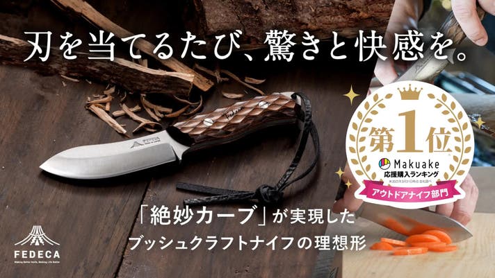 2025年3月。応援購入サービス「Makuake」で発表した「FEDECA ブッシュクラフトナイフ」は、アウトドアナイフ部門で歴代1位を記録しました。(2025年3月30日時点/自社調べ)
