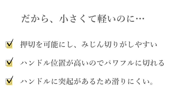 - 「小さいのに、スッと切れて気持ちいい。」軽やかなのに、パワフルに切れる安定感