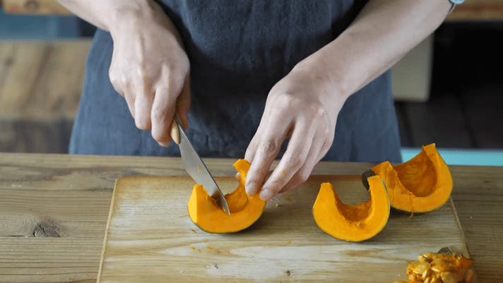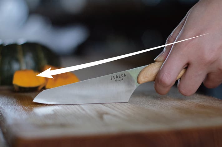 もちろん、このような大きな食材には、大きな三徳包丁のほうが便利。でも、corebaccaでも刃を少しずつ動かせばスムーズに切れます。