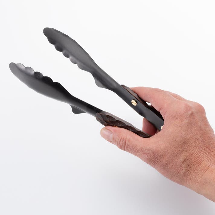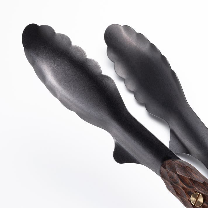 持ち手が板状のトングとは異なり、しっかりとした厚みを持つ木製ハンドルを備えました。ナイフの柄のように手のひら全体で包み込める設計が、安定した使い心地を支えます。