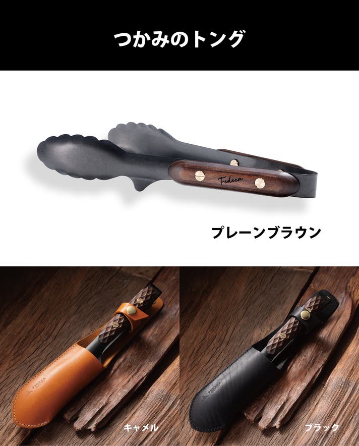 つかみのトング本体に、デザインを統一した「専用レザーケース」をセットにしました。