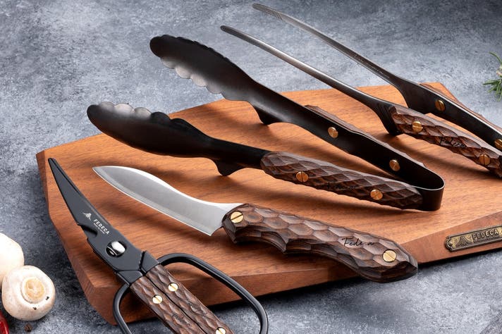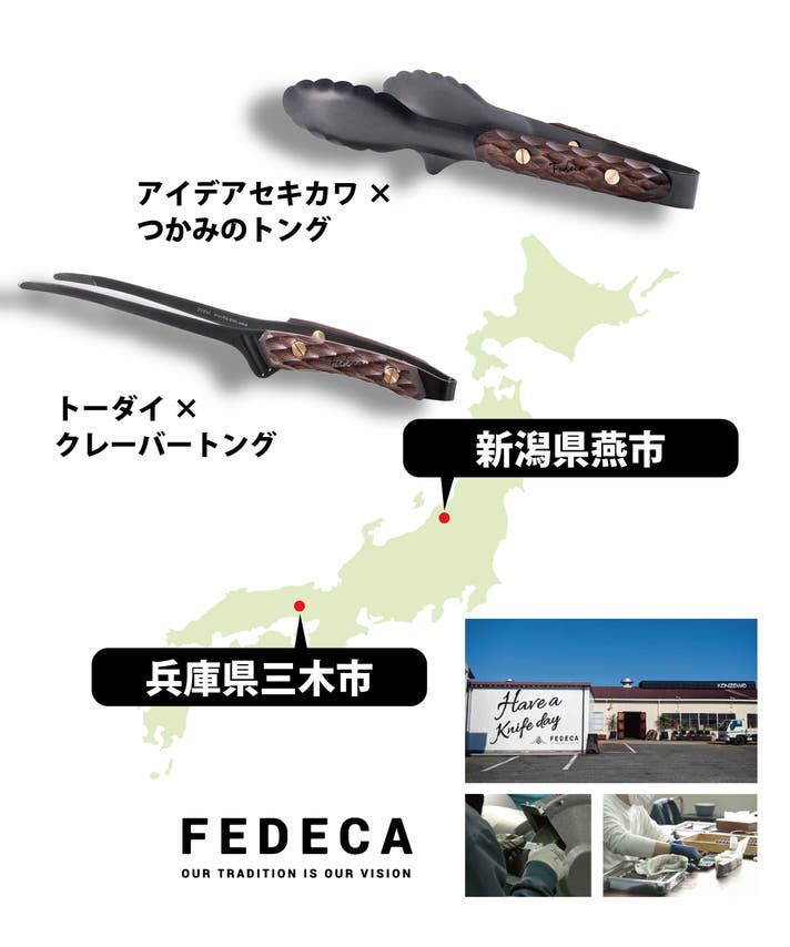 そしてハンドルは、「播州三木」で私たちFEDECAが、ナイフハンドル製作で培ってきた木工加工技術をもって一つひとつ仕上げ、燕のトングと融合させます。