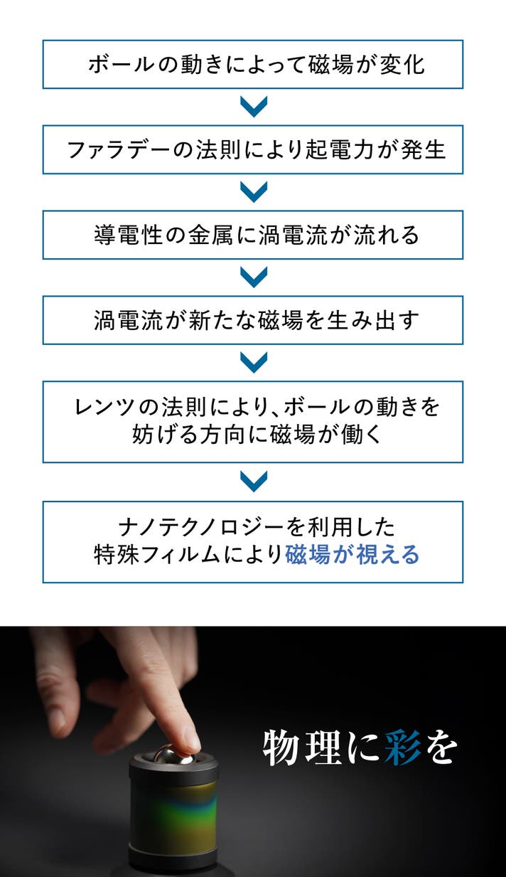 銅と磁石だけで構成されたミニマルな設計と19世紀の物理原則が、時代を超えて、変わらぬ楽しさと驚きを届けます。
