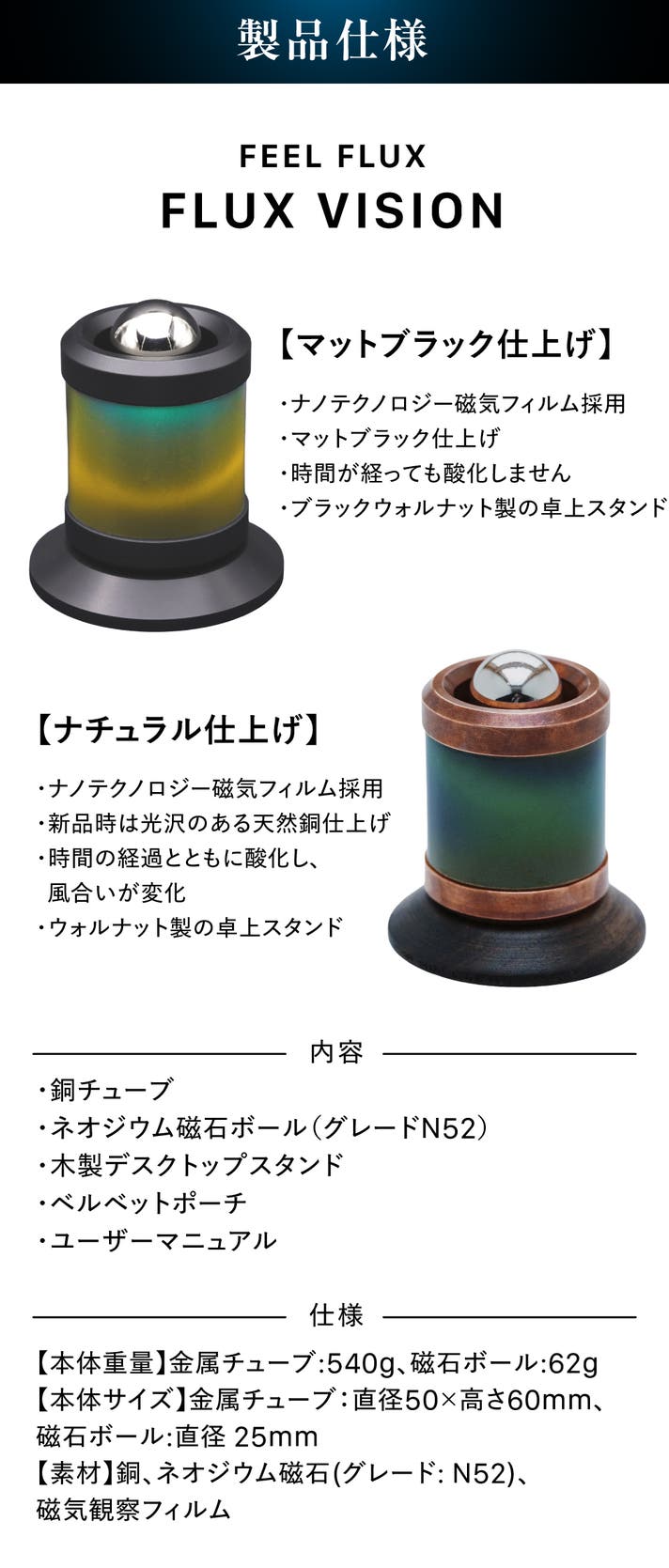 FLUX VISION (フラックスビジョン)は、磁場を色彩で可視化する特殊フィルムを採用。磁場を色の変化で美しく伝えます。