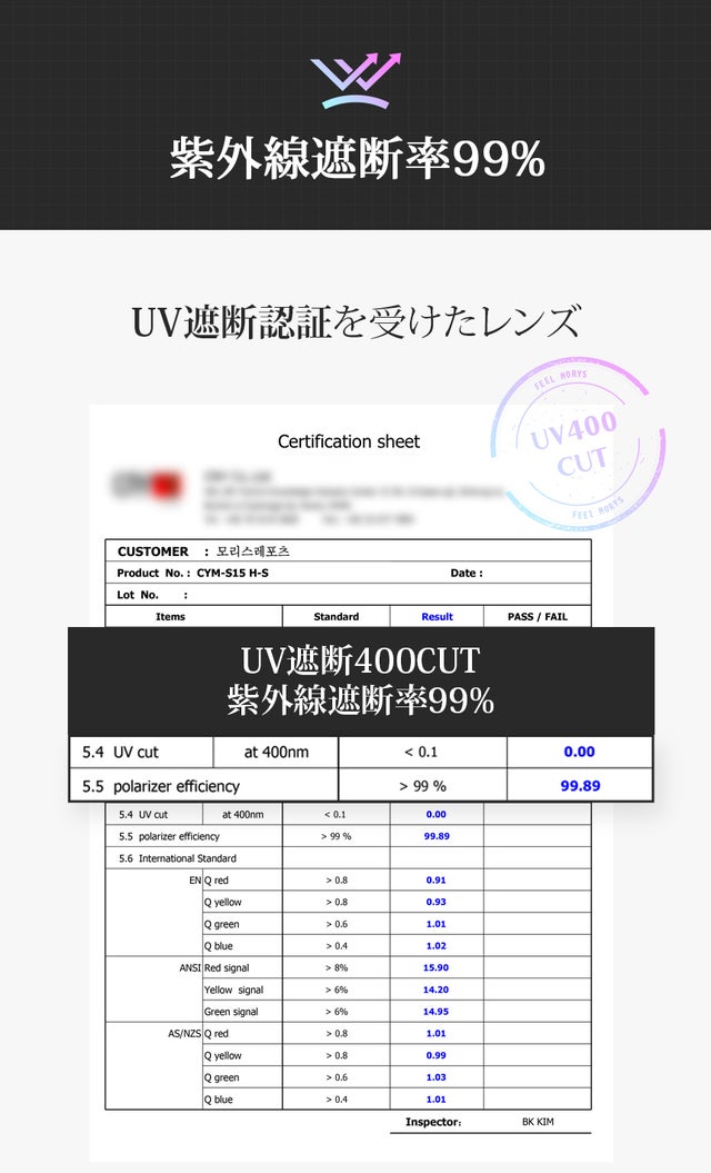 厳格なテスト環境で99.89%以上のUVカット機能の認証を得たレンズで紫外線より安全に目を守ることができます。