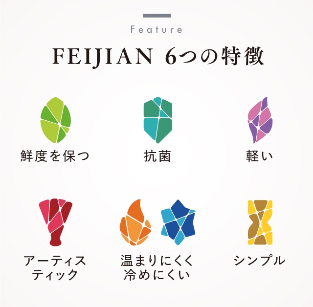 FEIJIANは、『新しいデザインと新しい素材で健康的なドリンクウェアを提供する』というミッションのもとに活動しており、主にチタン製品の企画と製造、販売を行っている専門メーカーと同じブランド名。