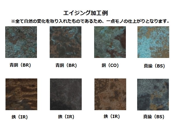 また、塩酸系洗剤を塗ることで金属特有の錆や黒ずみを意図的に発生させることも可能です。全て自然の変化を取り入れたものであるため、一点モノの仕上がりとなります。